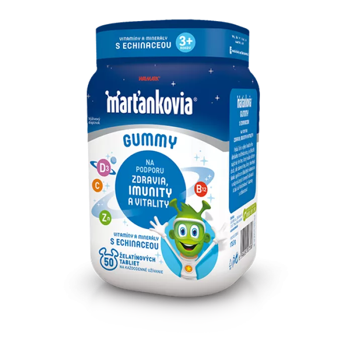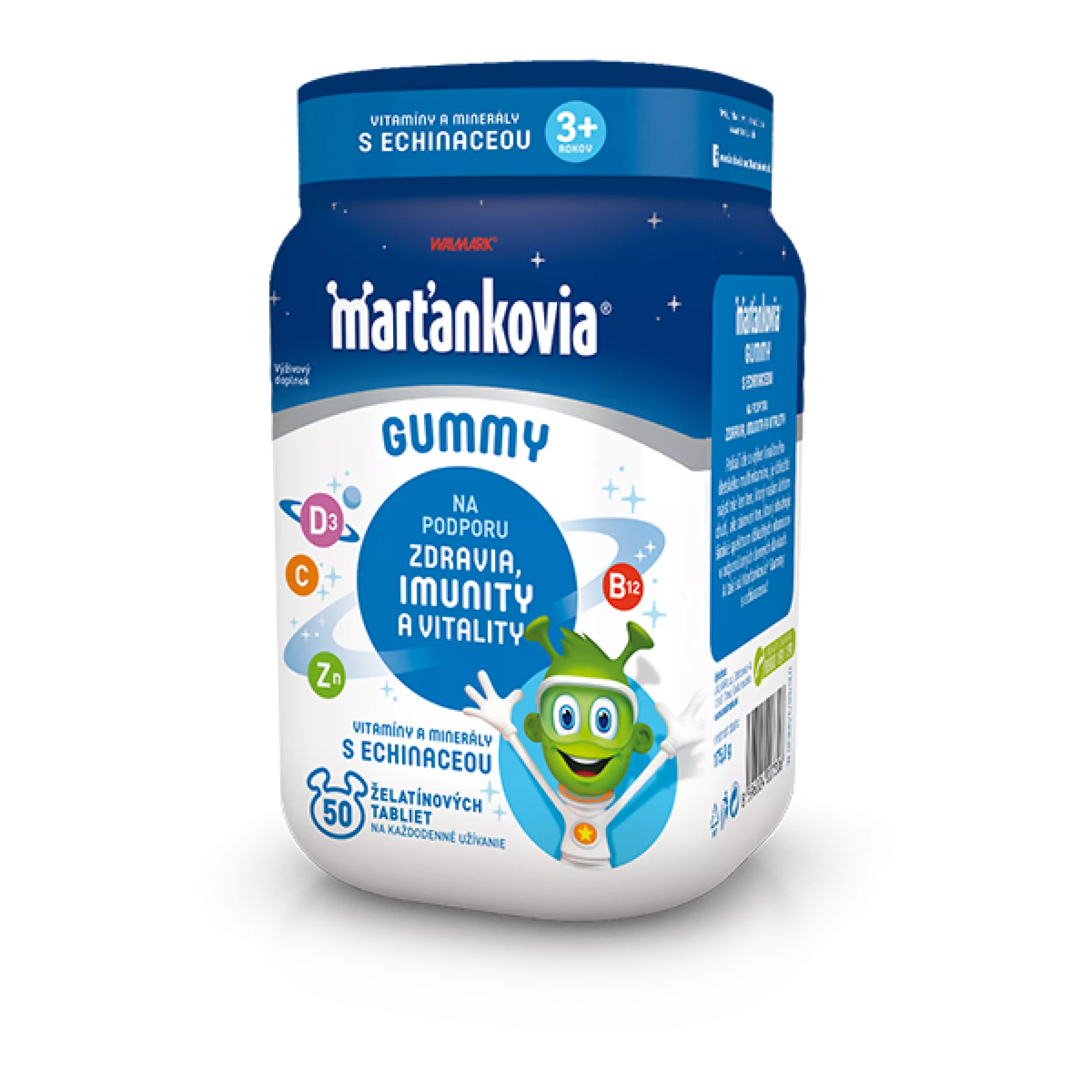 Marťankovia® Gummi mit Echinacea sind leckere Gelatine Marťankovia. Sie enthalten einen Extrakt aus dem traditionell verwendeten Kraut Echinacea purpurea. Marťankovia® Gummi mit Echinacea sind in einer Mischung aus vier Fruchtgeschmacksrichtungen (Erdbeere, Orange, Kirsche und Zitrone) erhältlich und enthalten ausschließlich natürliche Farbstoffe.