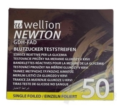 Medizinisches Gerät. Wellion NEWTO Blutzuckerteststreifen sind dünne Streifen mit einem chemischen Reagenzsystem. Sie werden zur Messung der Glukosekonzentration mit Wellion NEWTON GAD-FAD-Glukometern verwendet. Auf die Spitze des Teststreifens wird Blut aufgetragen. Das Blut wird dann automatisch in die Reaktionszone gesaugt. Die Reaktion findet in der Reaktionszone des Bandes statt. Während der Reaktion entsteht ein Übergangsstrom, den das Messgerät erfasst. Basierend auf diesem Strom wird dann die Blutzuckerkonzentration berechnet. Das Ergebnis wird dann auf dem Display des Messgerätes angezeigt. Die Messgeräte sind so kalibriert, dass sie plasmaäquivalente Ergebnisse anzeigen. Zur Verwendung in der In-vitro-Diagnostik. Die Teststreifen sind ausschließlich zur Verwendung außerhalb des Körpers und zu Messzwecken bestimmt. Zum Selbsttest und zur Anwendung durch Profis.